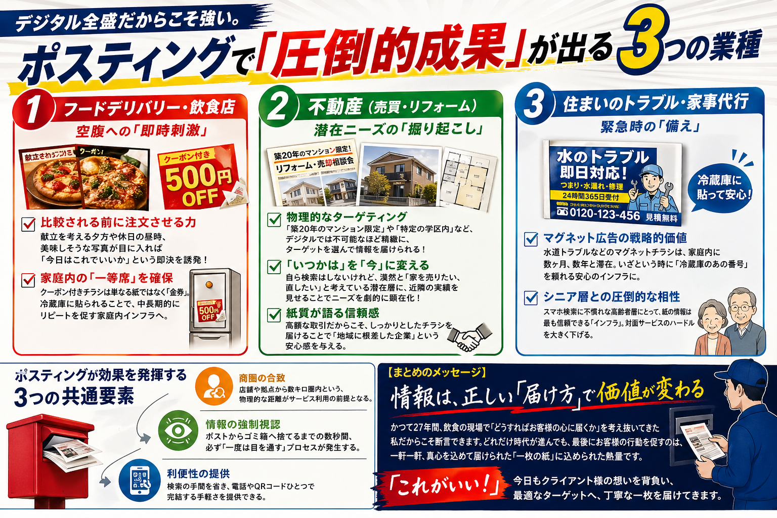 集合ポストポスティングをさらに強化!集合住宅の各戸玄関ポストに直接配布で格段に閲覧率が向上します。