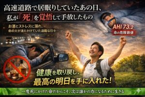 ある日、長距離の高速運転中に、急激な睡魔に襲われました。気づいたとき、私は高速道路の真ん中で停車したまま眠っていたのです。一歩間違えれば大惨事。しかし、当時の私はその恐怖に蓋をし、過労と深酒の毎日を続けてしまいました。